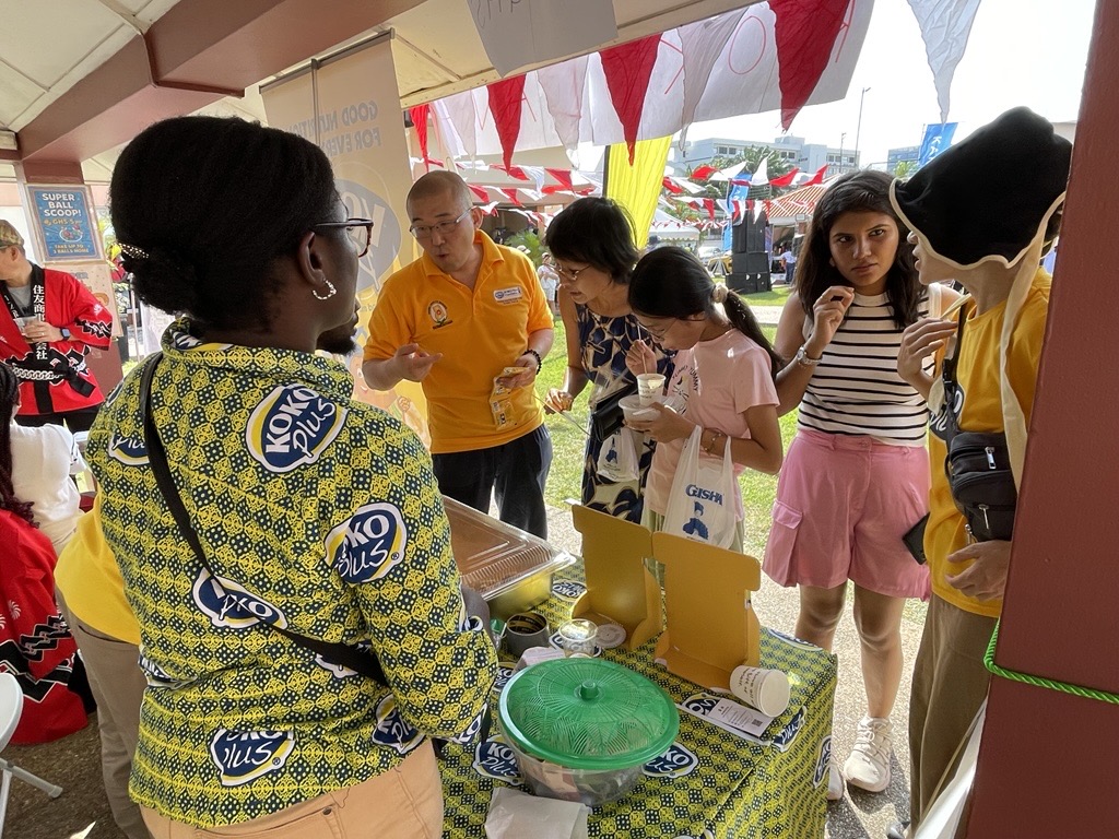 ココプラスファンデーションは現地の主食である「フフ」と、白玉団子にココプラス🄬をまぶした「ココプラスだんご」各1個を販売する出店を出しました。「スイーツだ」「おいしい」「フフにこんな食べ方があるのか」ガーナ人、日本人、いろいろな国籍の方に楽しんでもらいました。